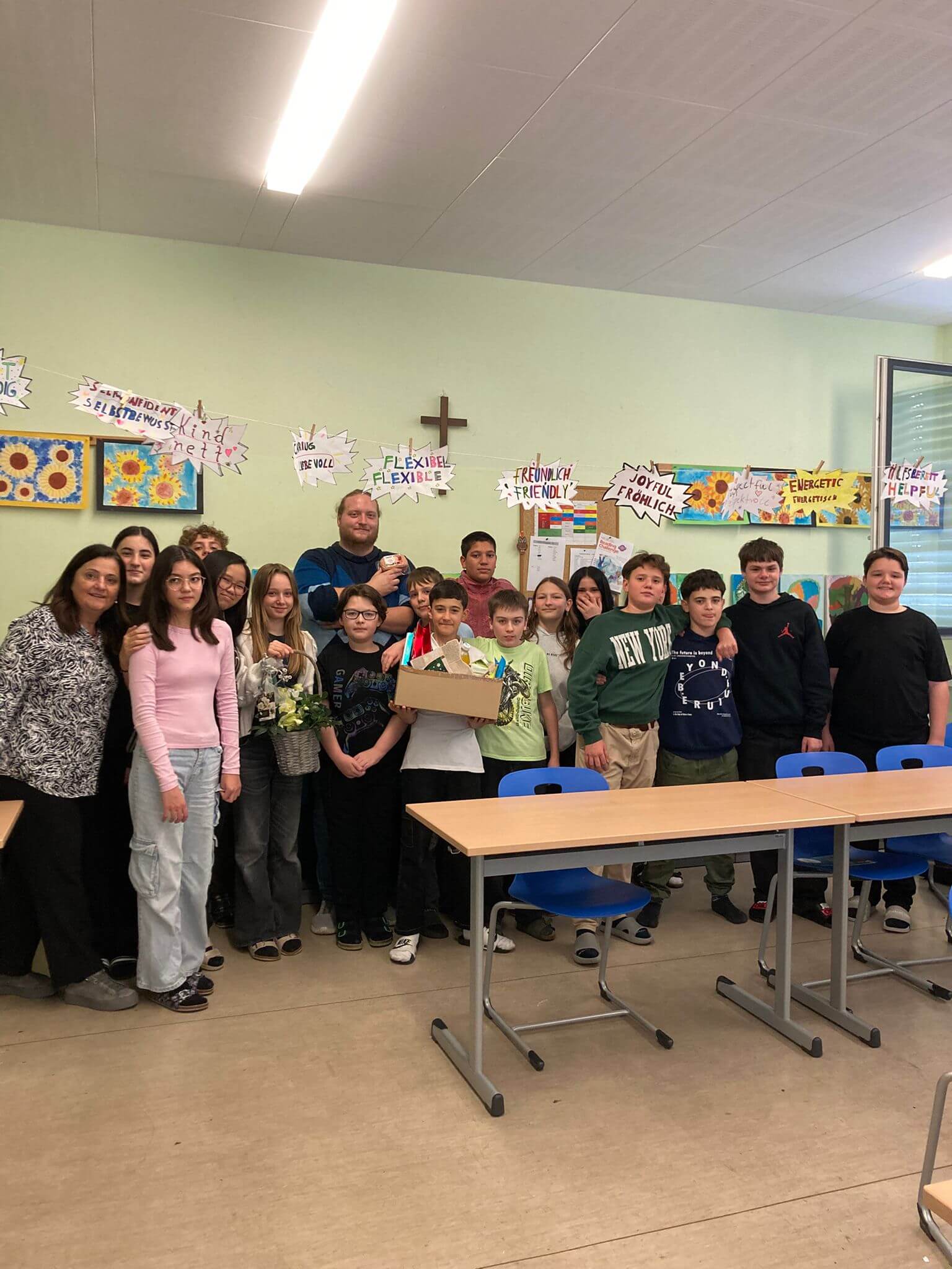 Vor gar nicht allzu langer Zeit ließ sich auch unser ehemaliger 3D-Druckbeauftragter und digitaler Alleskönner Herr Wallner-Mraszek bei uns blicken. Er nutzte seinen schulfreien Tag am Dienstag, 11. 11. 2025, Festtag des Heiligen Martin und Beginn der Narrenzeit, um uns mit seinem Besuch zu beehren und der 3c, von der er zwei Jahre lang Co-KV war, Leckereien für zwischendurch zu bringen. Darüber haben sich viele narrisch gfreid, wie es im Dialekt so schön heißt und auch er ging nicht leer es, denn er bekam eines seiner Lieblingsgerichte geschenkt - einen riesigen Brocken Leberkäse.
