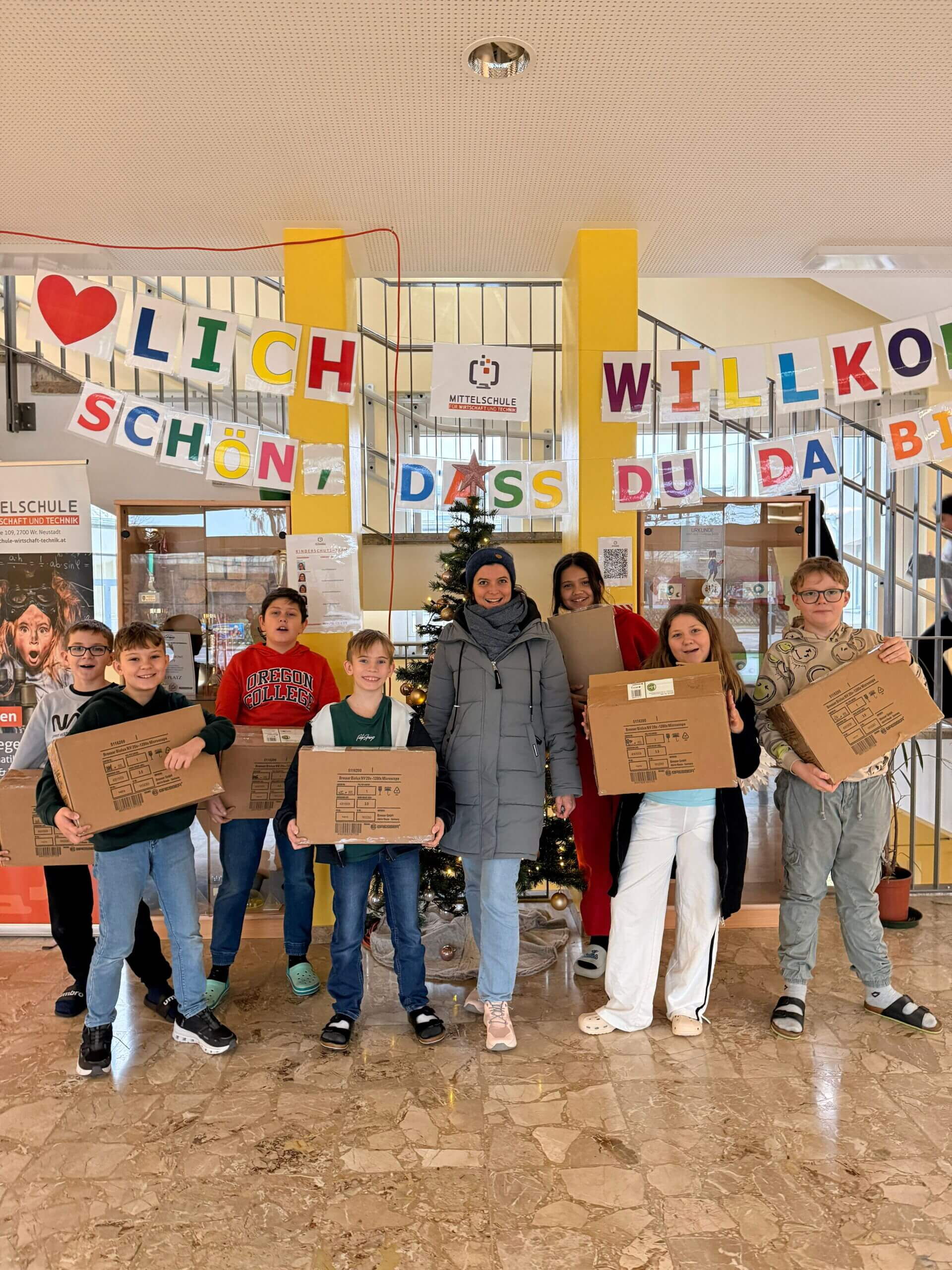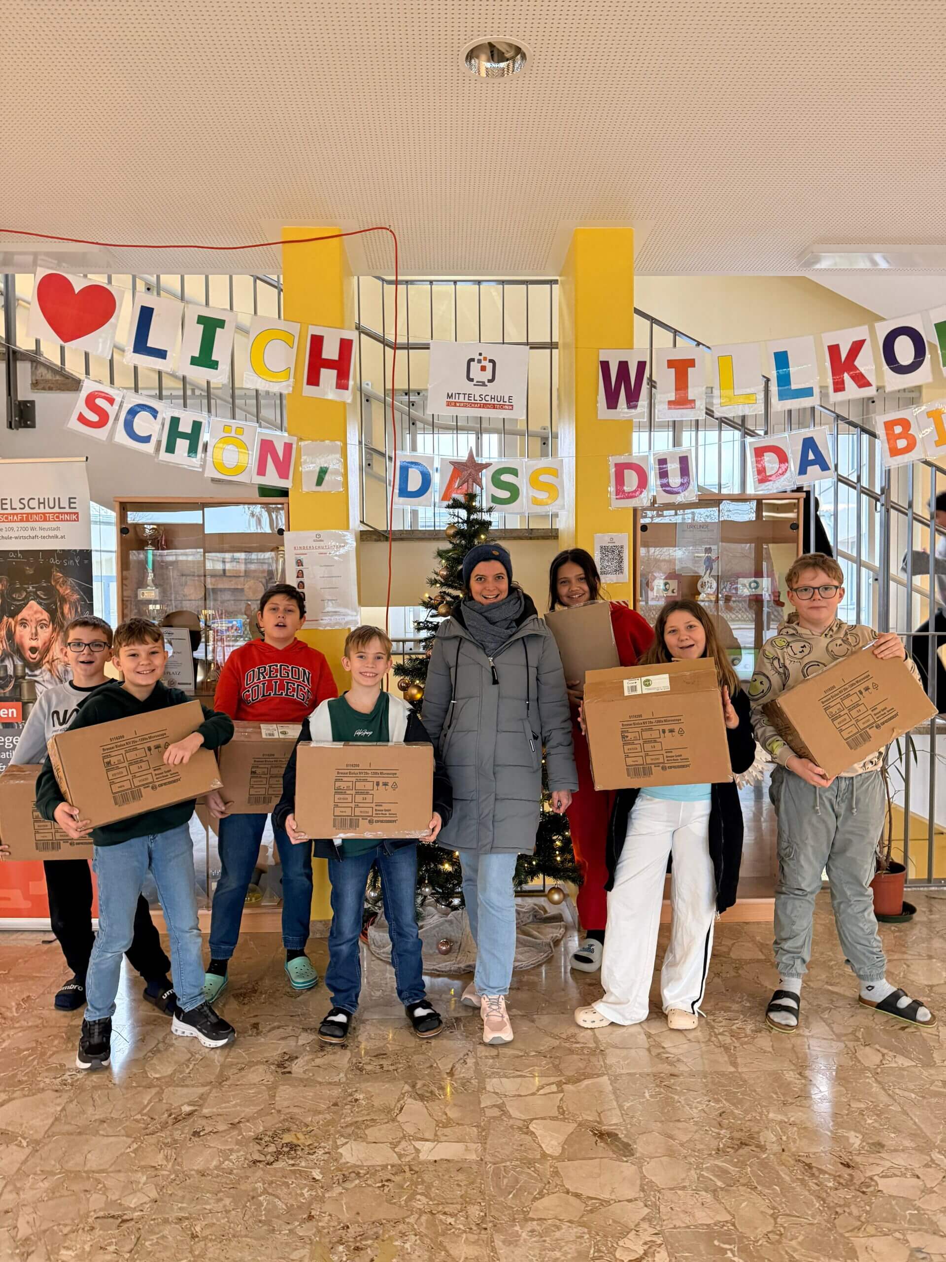 Am Montag, 15. 12. 2025, erhielt die 1c eine großzügige Spende der Stadtgemeinde Wiener Neustadt - sechs brandneue Mikroskope.