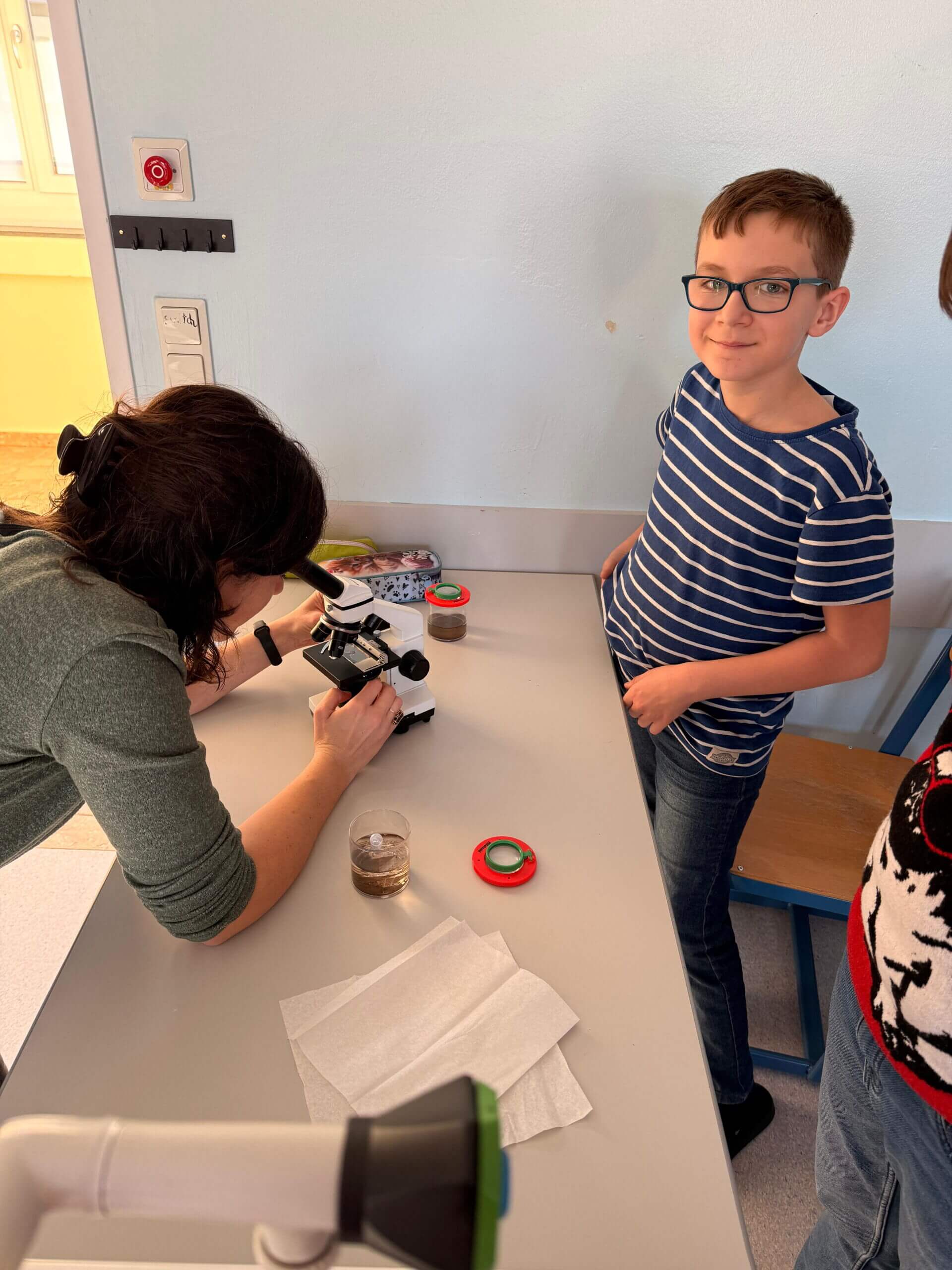 Unsere jungen Forscherinnen und Forscher entnahmen sogleich diverse Proben, die nach dem Aufbau der Mikroskope genau untersucht wurden. Vielen Dank an die Stadtgemeinde und an KV Frau Benatti für das Wecken des Forschergeistes.