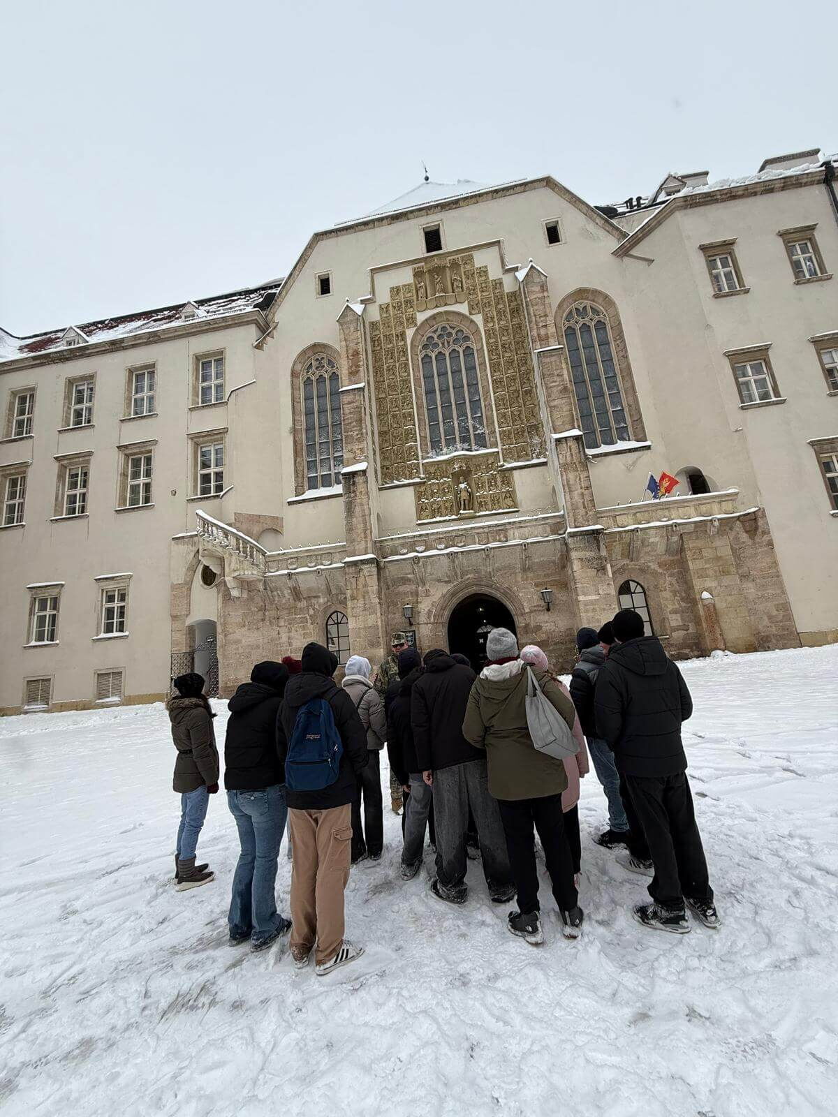 Am Freitag, 20. 02. 2026, kämpften sich die Schülerinnen und Schüler der 3c bei eisiger Kälte zur Theresianischen Militärakademie, der ältesten Militärakademie der Welt, die seit dem Jahr 1752 Offiziere ausbildet.