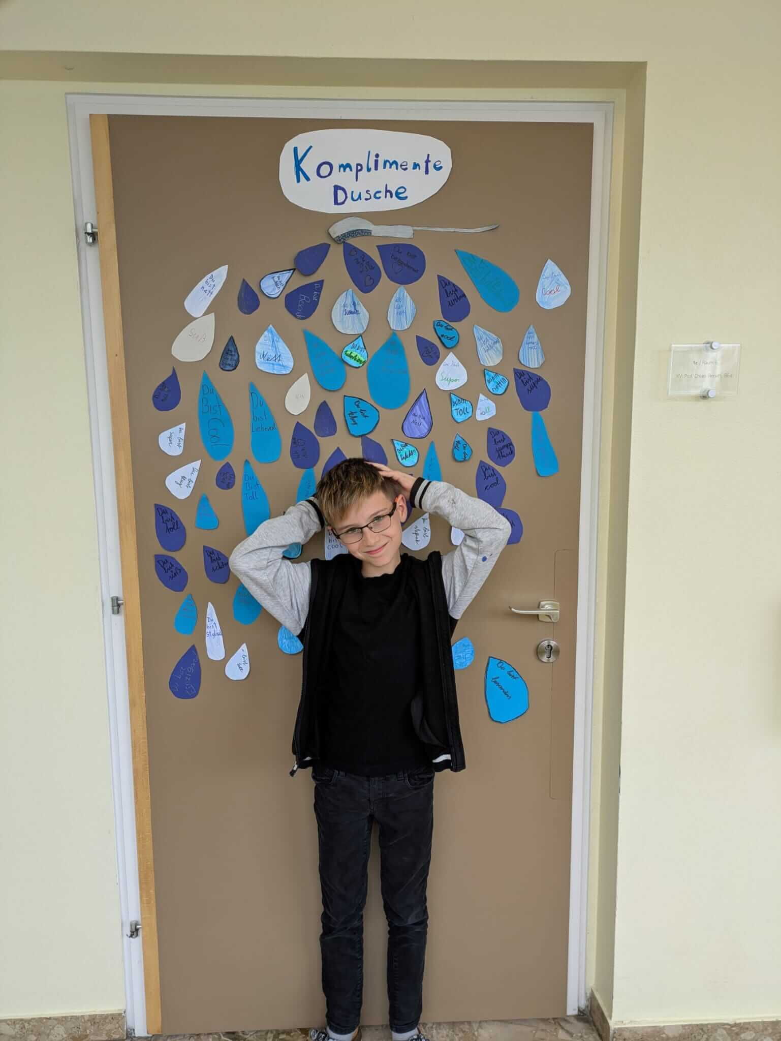 Mit ihrer Komplimentedusche, bei der jeder Wassertropfen ein Kompliment enthält, und dem von KV Frau Benatti eingereichten Foto, das Sebastian F. beim Haarewaschen unter der Komplimentedusche zeigt, gewann die Klasse eine Partie Spikeball. So ein Kompliment tut halt nicht nur den Haaren, sondern vor allem der Seele gut.