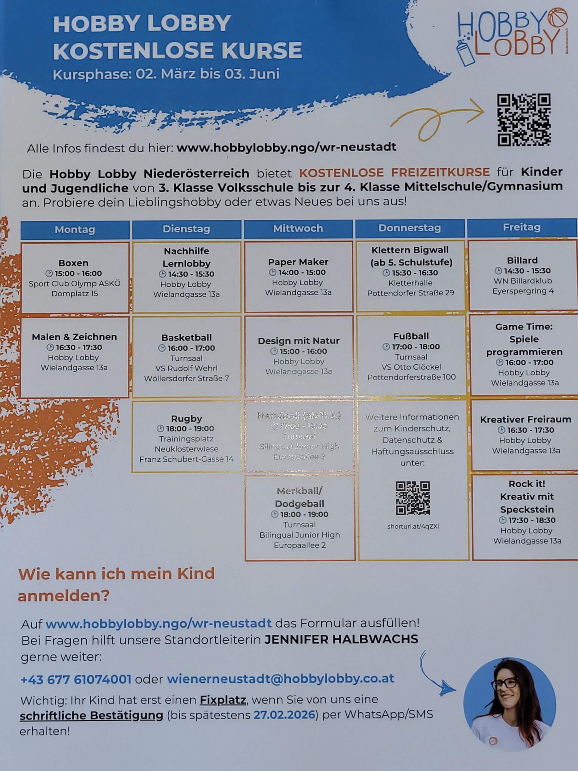 Die Kursphase, bei der eine Vielzahl interessanter und kostenloser Kurse besucht werden kann, startet am 02. 03. 2026. Einen Überblick findest du direkt hier beim dritten Bild und natürlich auf der Homepage der Hobby Lobby unter ➡️ www.hobbylobby.ngo/wr-neustadt